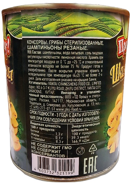 Состав: шампиньоны, вода питьевая, соль пищевая, регулятор кислотности (кислота лимонная).